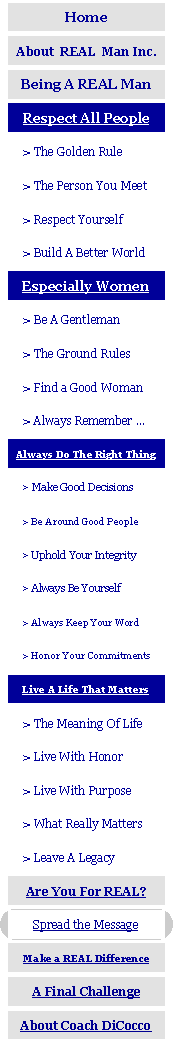Help spread the message of what it means to be a REAL man. Get the word out—through your words and your deeds—that being a REAL man is all about the way you live your life, the way you treat other people, and ultimately, what you do for others and for the world around you.