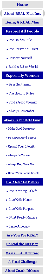 About the “Inc.” ~ What does it mean? Why the Inc.? ~ It stands for “incorporated,” but not in the way you might think. The mission of REAL Man Inc. is not only to get boys and men to read the message, but to reflect on and incorporate that message into their daily lives. Becoming a real man is not something that you can merely pay lip-service to. It is something that you must believe in, and more importantly, it is something that you must live out: in your words and in your actions. Making a commitment to being a real man is not merely a decision; it is a way of life.